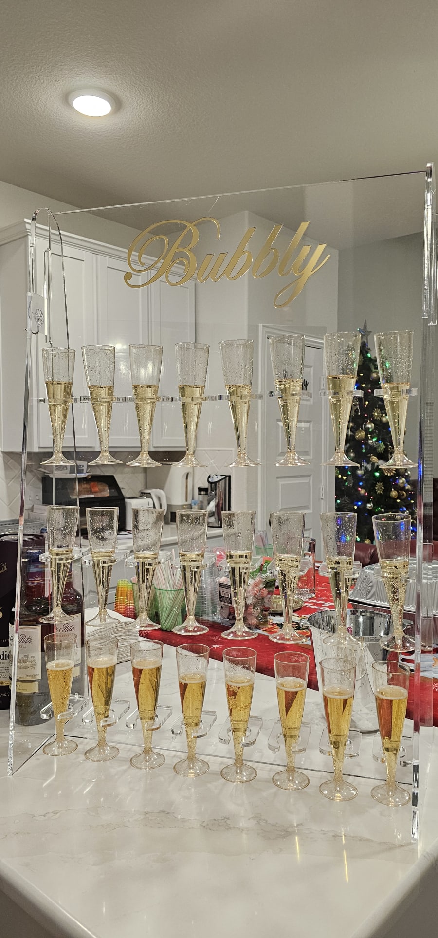 Designed to hold up to 48 champagne glasses, this clear acrylic wall isn't just a functional accessory — it's a statement piece. Ideal for upscale parties, cocktail events, and chic bars, our champagne wall transforms any venue into a glamorous setting. For smaller gatherings, you can opt for the tabletop version, which accommodates 24 glasses, making it versatile for any occasion.