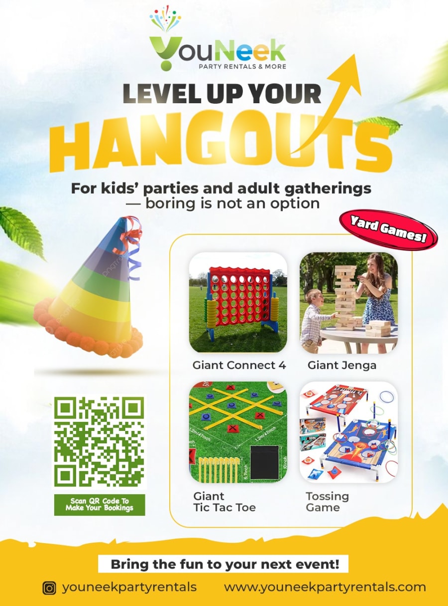 π Yard Games Party Package – Pick 4 Take your event to the next level with our Youneek Yard Games Party Package! Choose up to 4 oversized lawn games to entertain guests of all ages. Perfect for birthday parties, school events, family reunions, weddings, and backyard fun in Fulshear and surrounding areas.